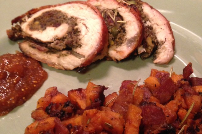 Paleo Prosciutto Wrapped Turkey Tenderloin with Fig, Cranberry, Pistachio, Cashew Cheese and Portobello Stuffing